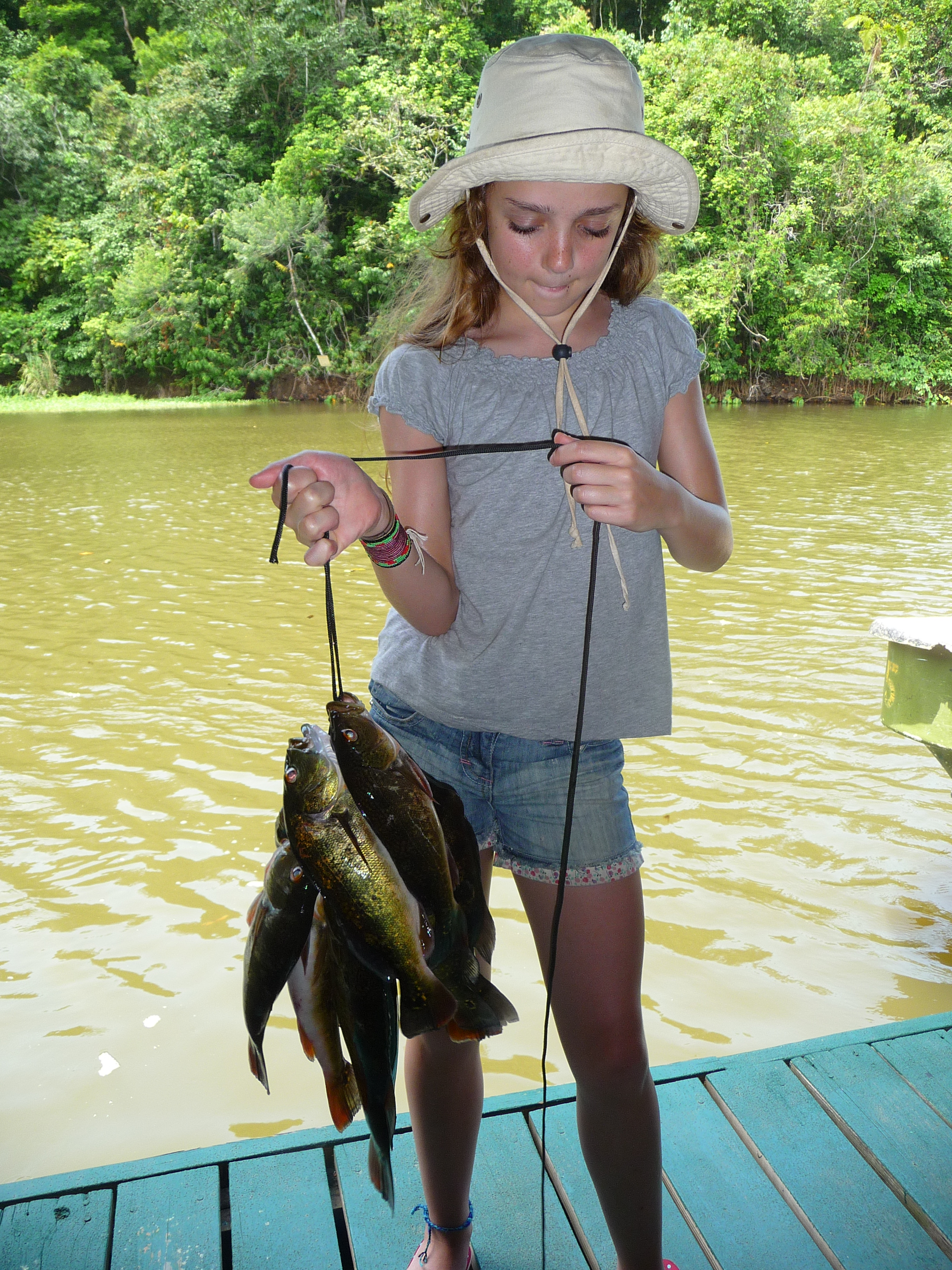 At three is fishing! When were staying at Jungle Land (on the beautiful Lake Gatun) we had the option of lounging about and swimming in the lake or fishing, I quite obviously chose fishing. We rode in a lancha for about ten minutes before settling down and casting out our lines. It wasn’t long until I got my first bite and then 11 more, it was like the fish were queuing up to be caught! My Mum got 3, Dad 2 and Jim 3. When we stopped getting so many fish we packed up and went to a different spot, unfortunately we had no success so we called it a day and went back to the floating hotel. When we came back we gave the kitchen the fish and had them served up for lunch.