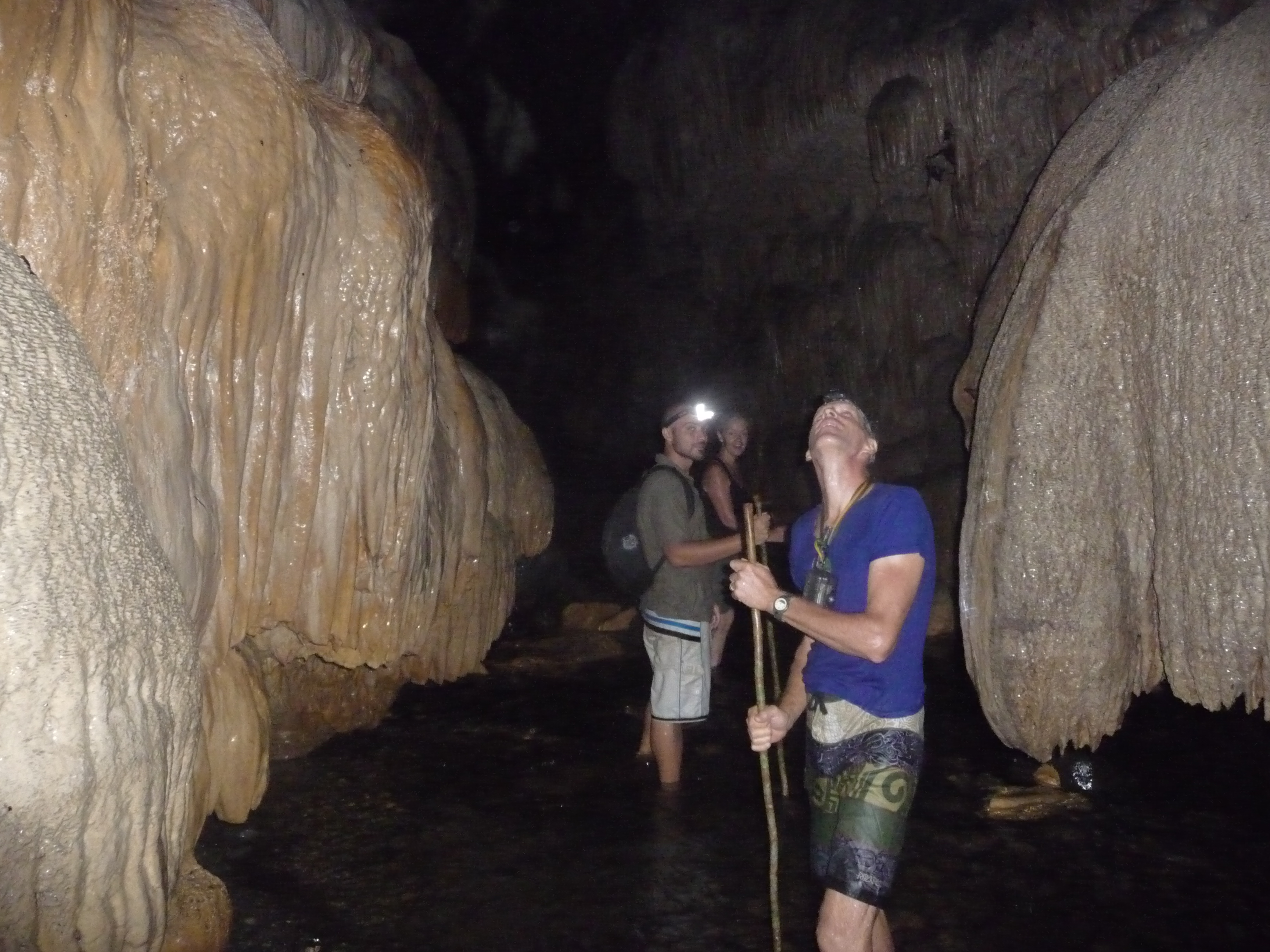 The river we had come ashore at is the same one that runs through the most famous cave system, so with head torches on and sticks to help navigate the rocky river bottom, we waded into the mouth of the cavern. The first stretch of the cave is open to the sky and feels quite spacious as the light filters down the steep canyon walls from the jungle above.