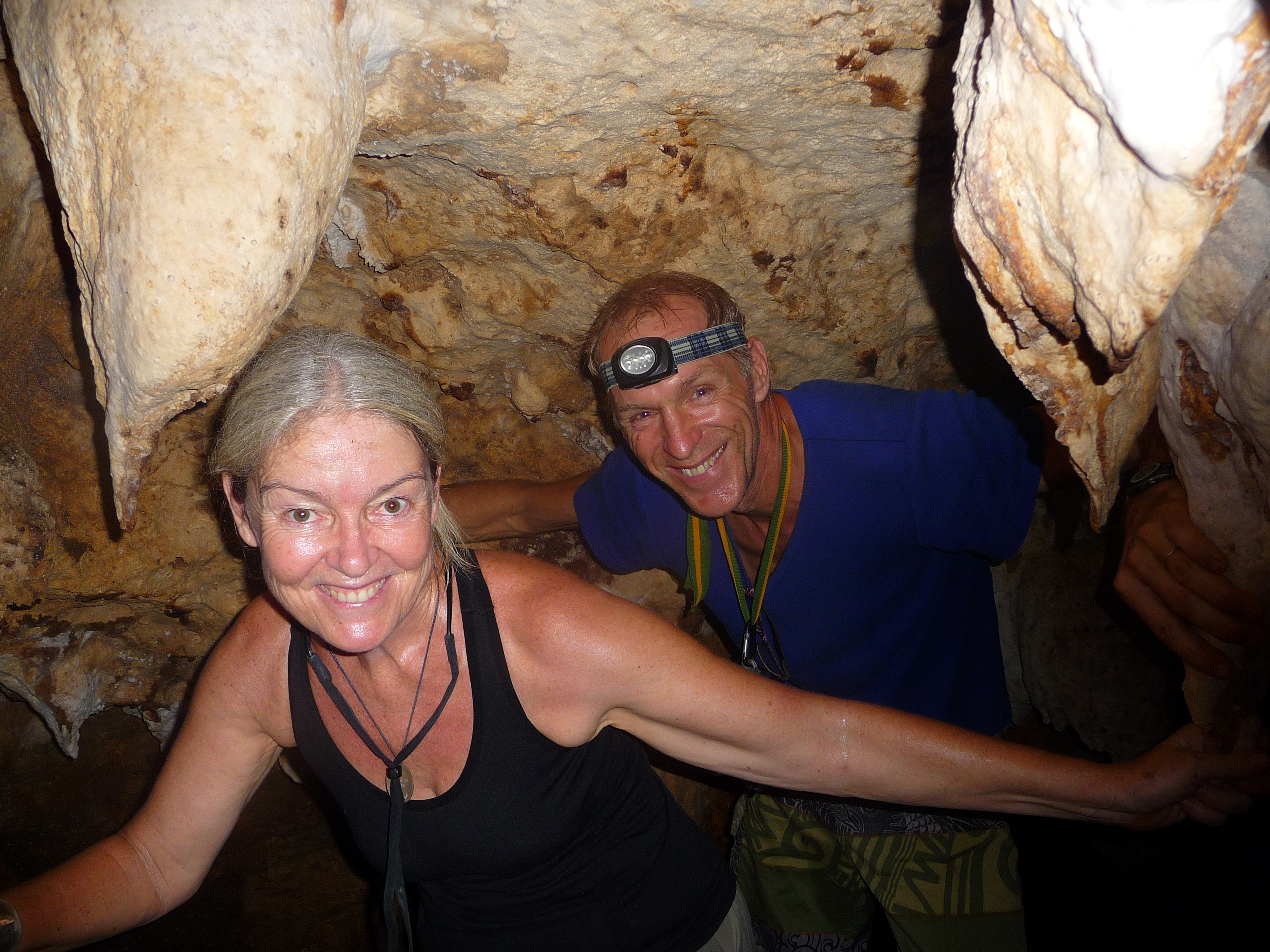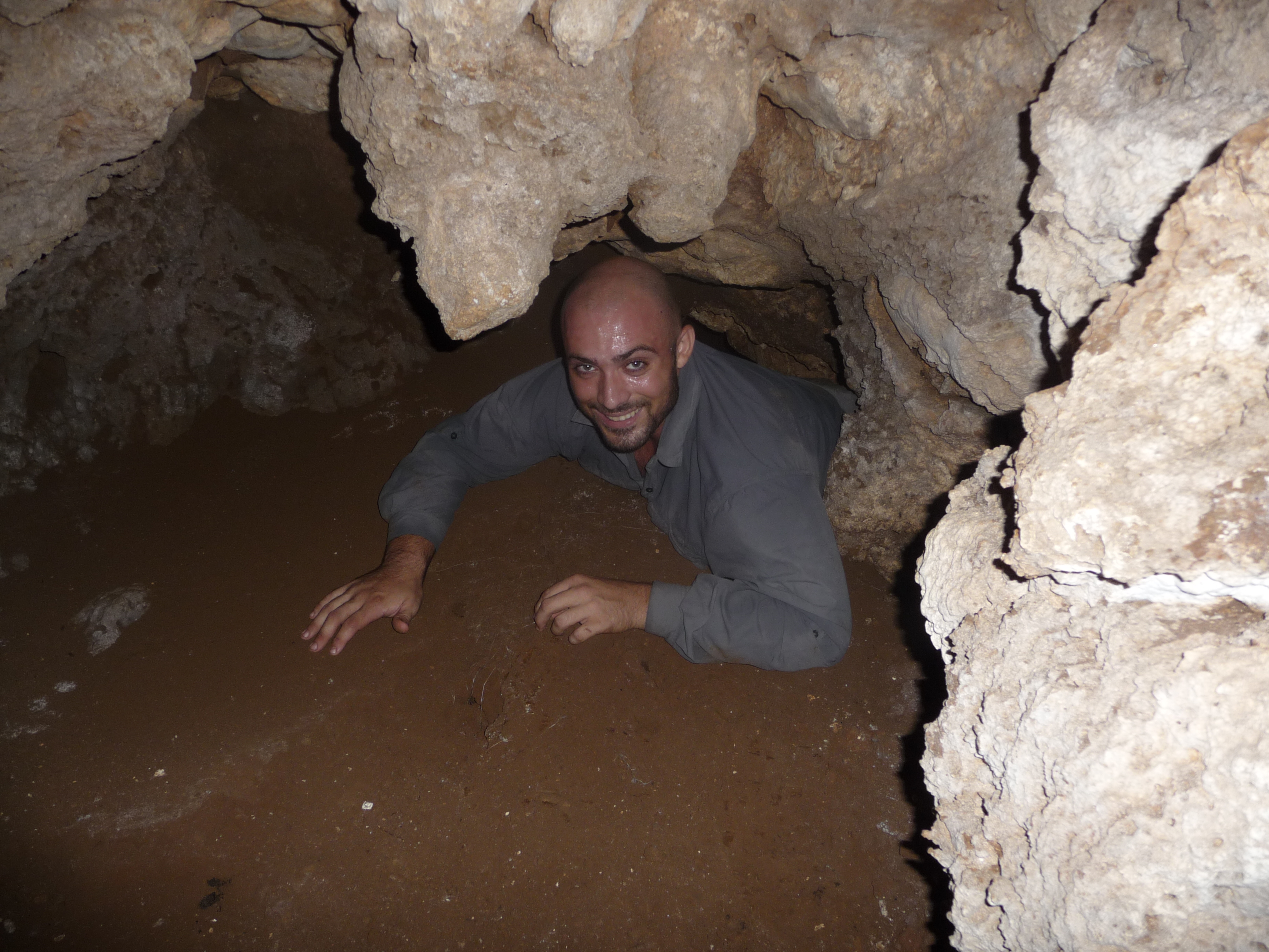 A large opening a short scramble up one rock face led to a dry chamber beyond and Austin’s hopes rose. It petered out after a few metres but a small opening remained between the limestone ceiling and the earth floor.